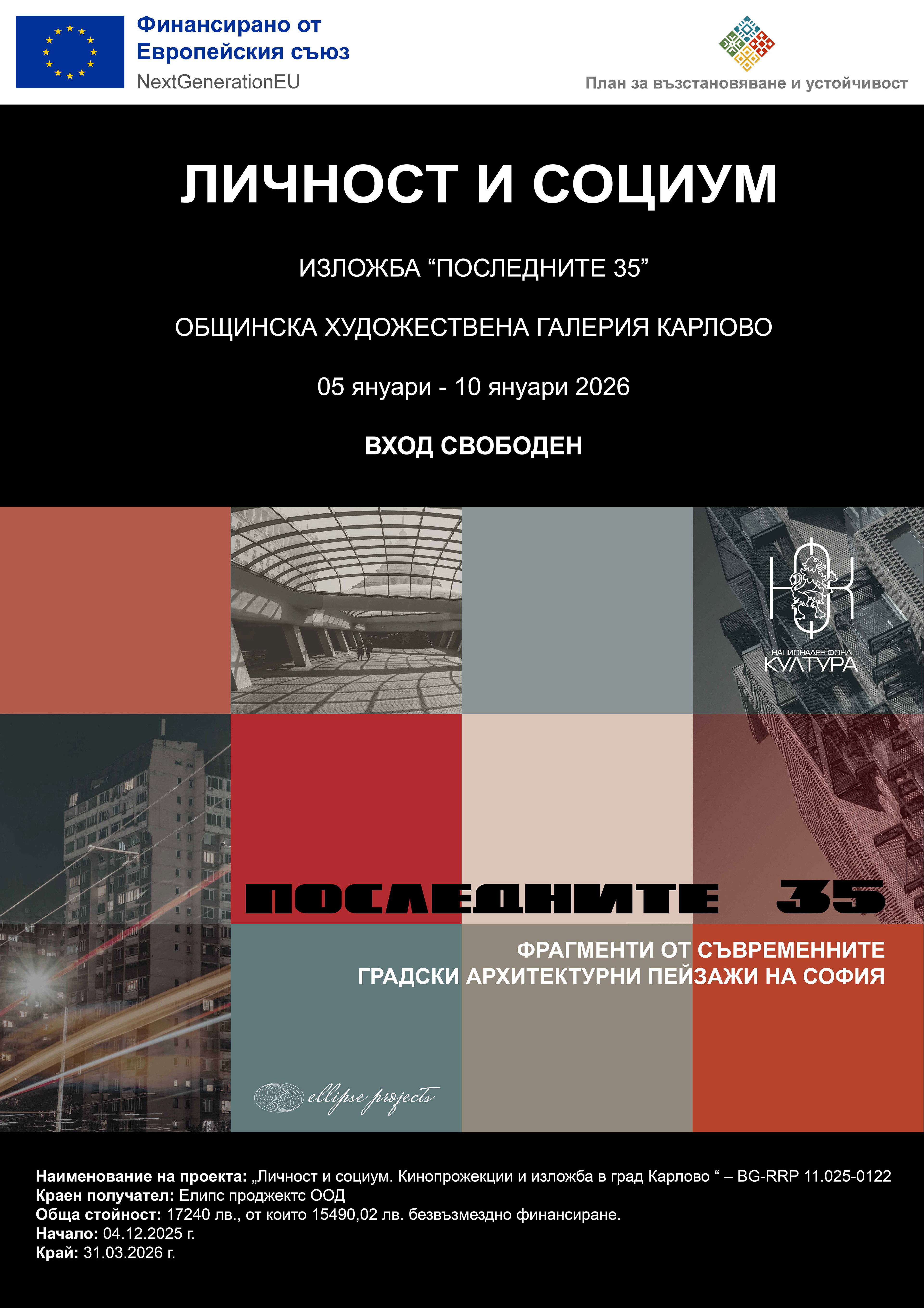 Проектът „Личност и социум“ е за разпространение на два на пръв поглед различни културни продукта – късометражен игрален филм със заглавие „Охлюви“, 25 мин. на режисьора Албена Пунева и изложба със заглавие: „Последните 35. Фрагменти от съвременните градски архитектурни пейзажи на София 1989-2024 г." Място на разпространение - гр. Карлово. Дружество Елипс проджектс ООД притежава изцяло всички права и върху двата културни продукта.