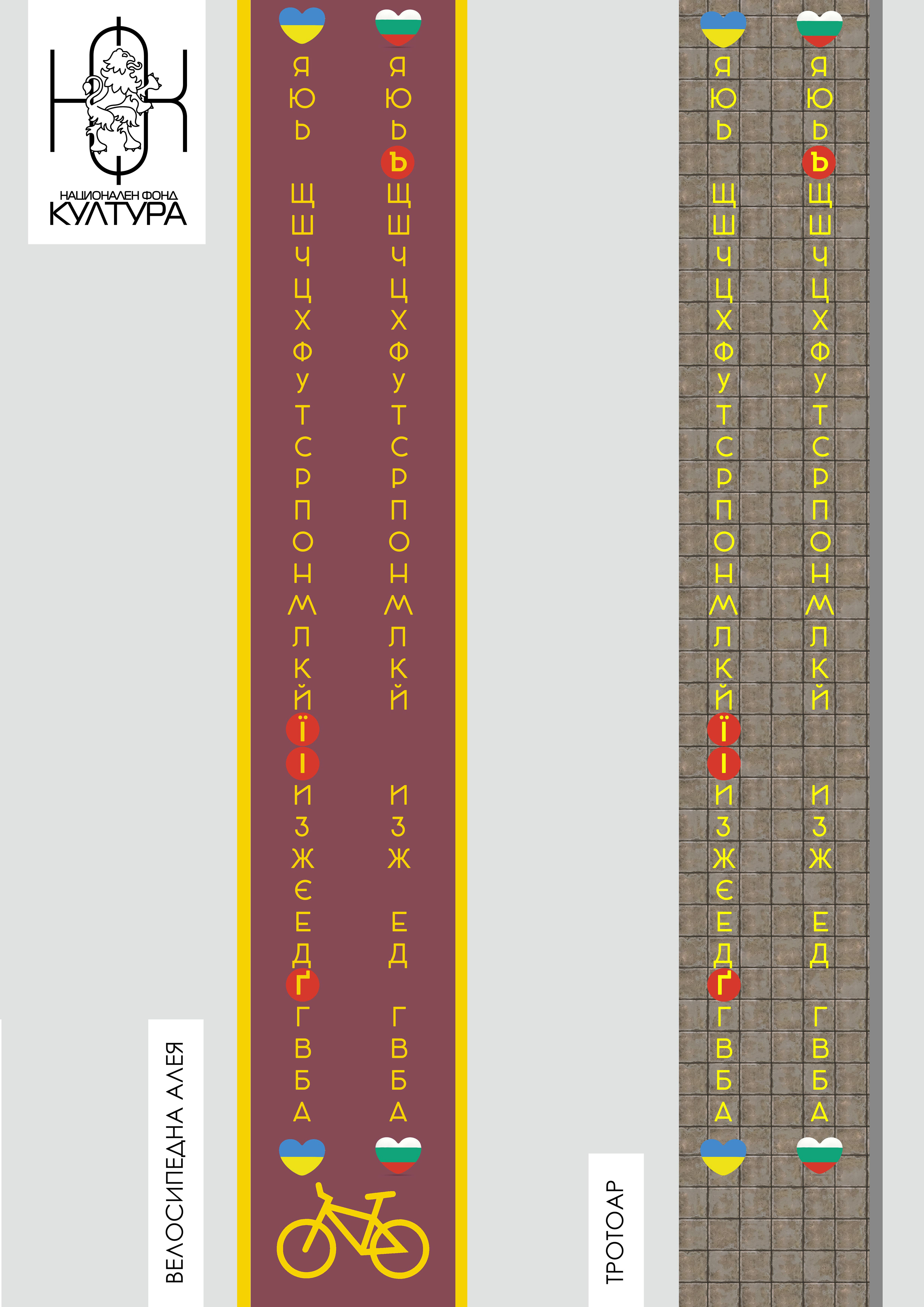 Предложените концепции са за линейни градски елементи - ВЕЛОСИПЕДНА АЛЕЯ и ТРОТОАР, които могат да се превърнат в подходящи носители на образа на буквите. Директната визуална съпоставка на двете азбуки интуитивно събужда усещане за културна близост между хора от формално различни държави и провокира различен поглед върху "чужденците".